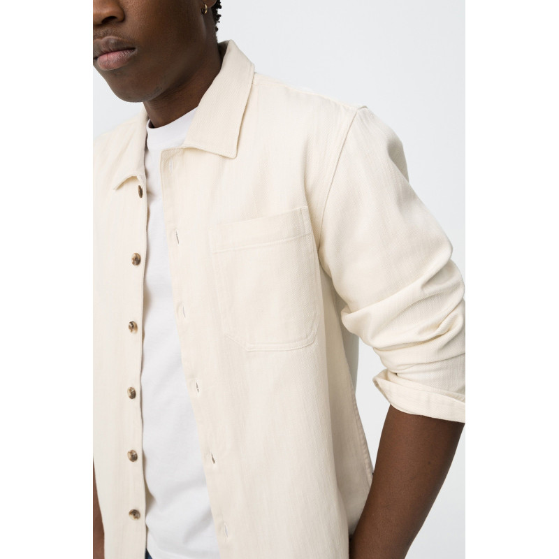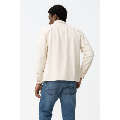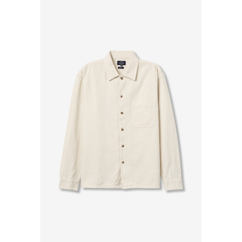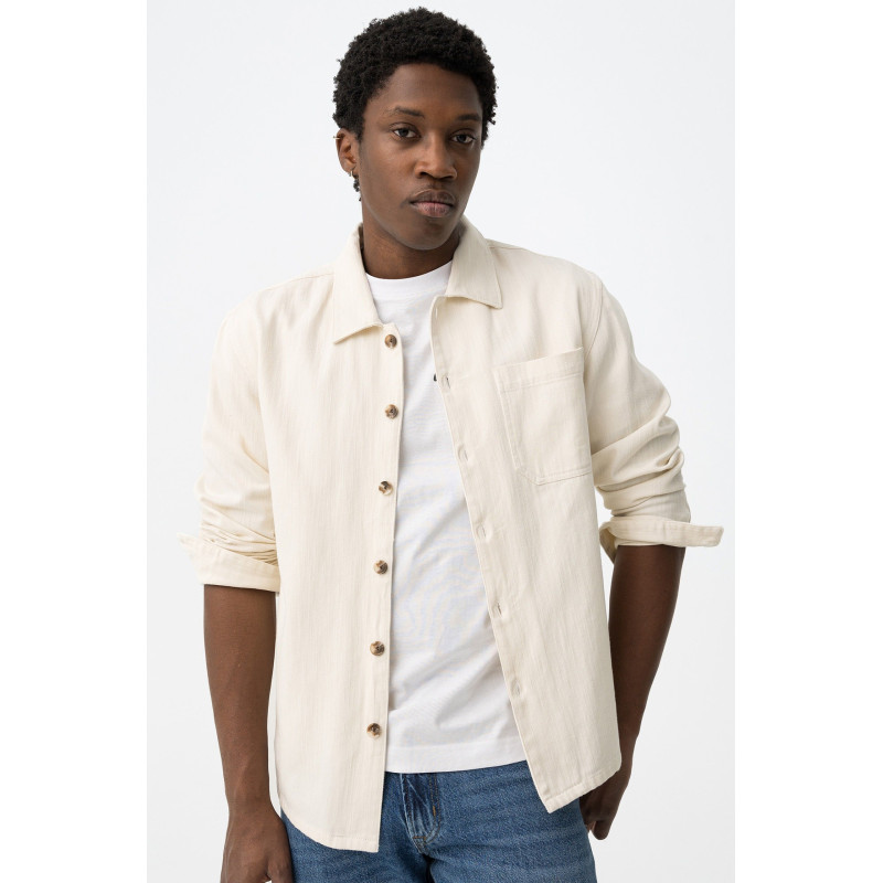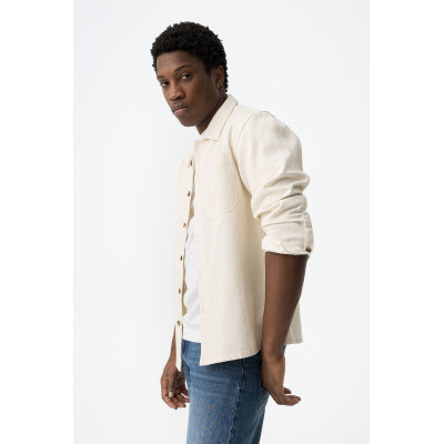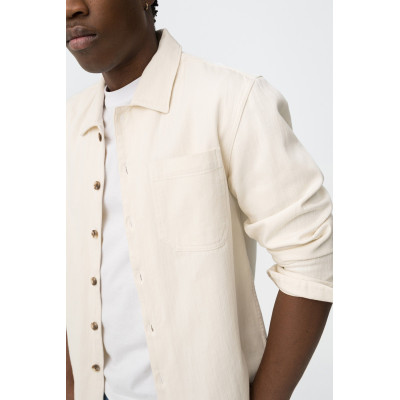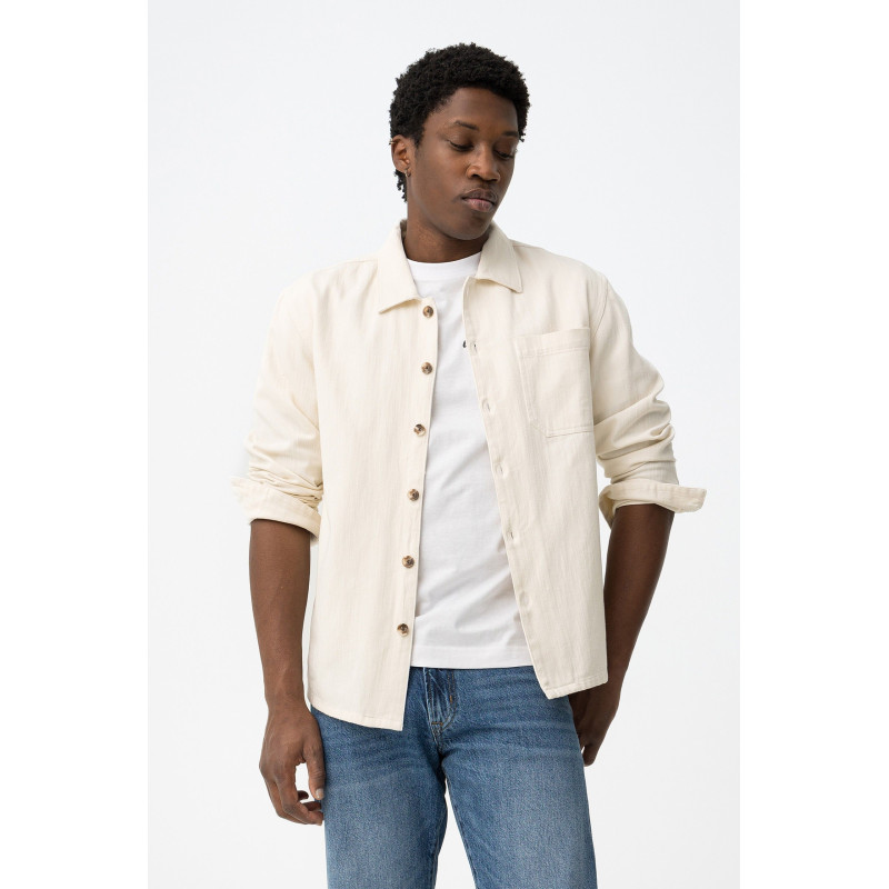 Camisa relaxed de color beige, corte recto, bolsillo en el pecho y botones visibles en la parte frontal.