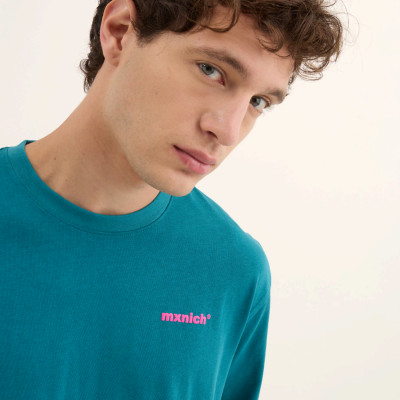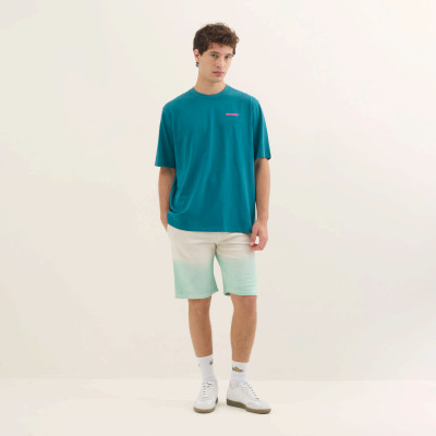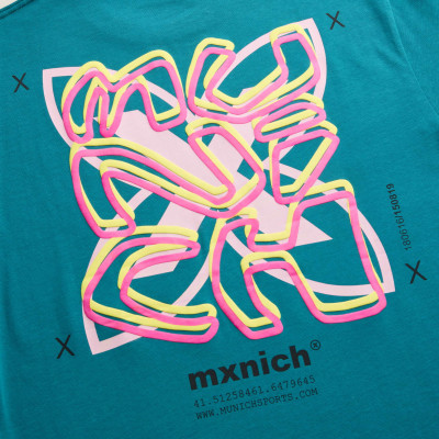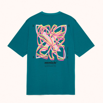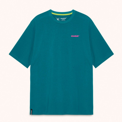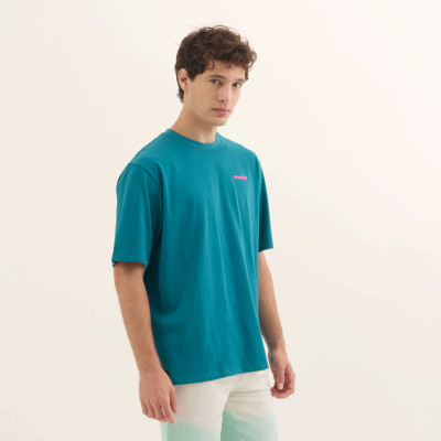 Esta camiseta de manga corta en un intenso azul ocean destaca por su corte oversize de tendencia y un dinámico diseño gráfico en la espalda que superpone el logotipo en tonos rosa y amarillo vibrante. Su confección con hombros caídos y cuello redondo proporciona una silueta moderna y relajada ideal para combinar con pantalones deportivos en un look de skate o con vaqueros oscuros para una salida urbana nocturna, garantizando una transpirabilidad y suavidad excepcionales.