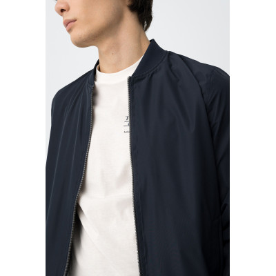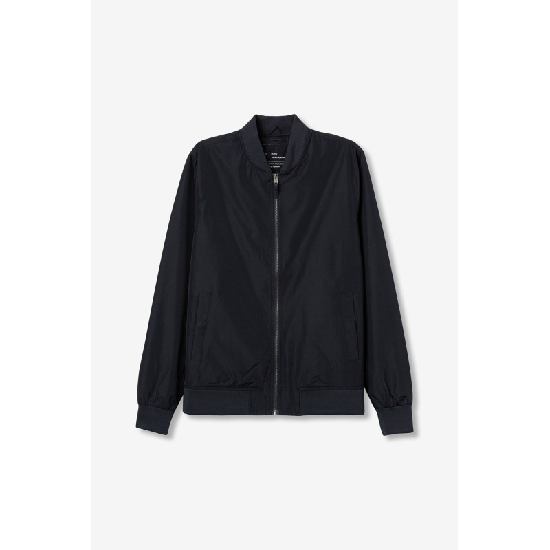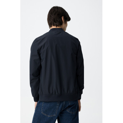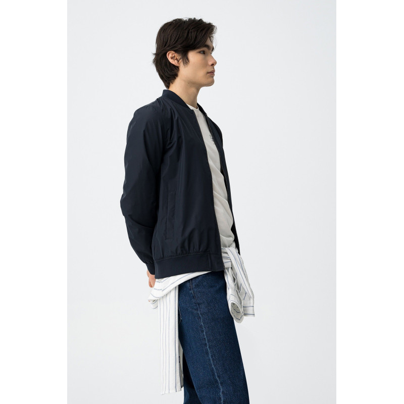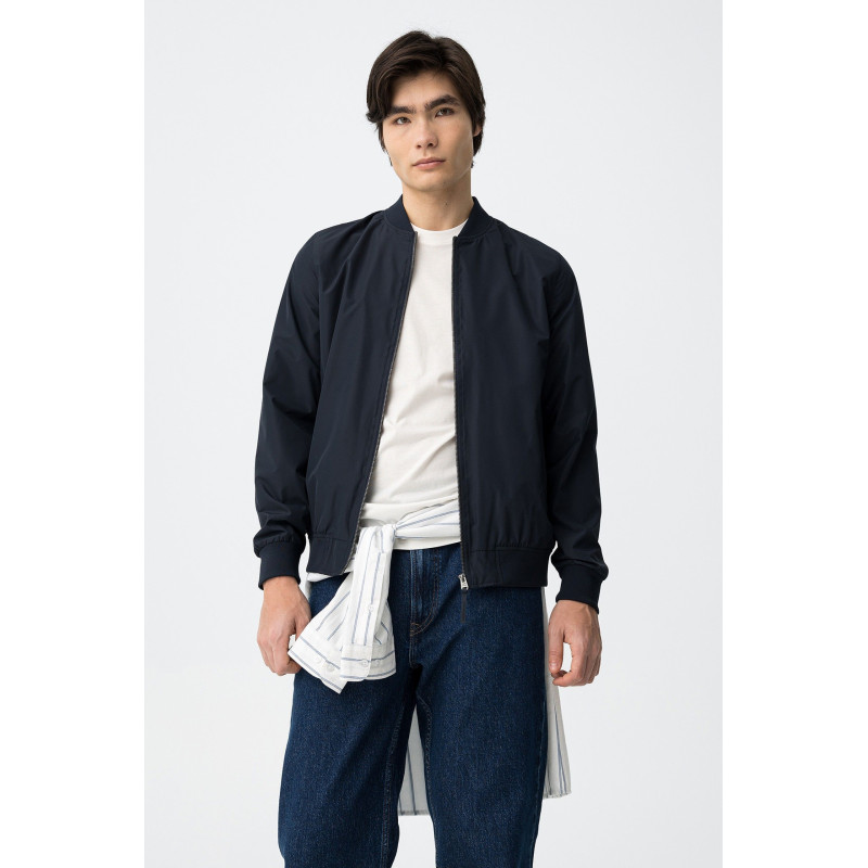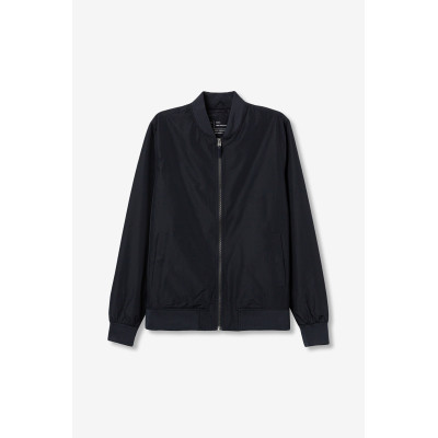 Cazadora tipo bomber de corte regular, cierre frontal, puños y bajo elásticos, estilo minimalista actual.