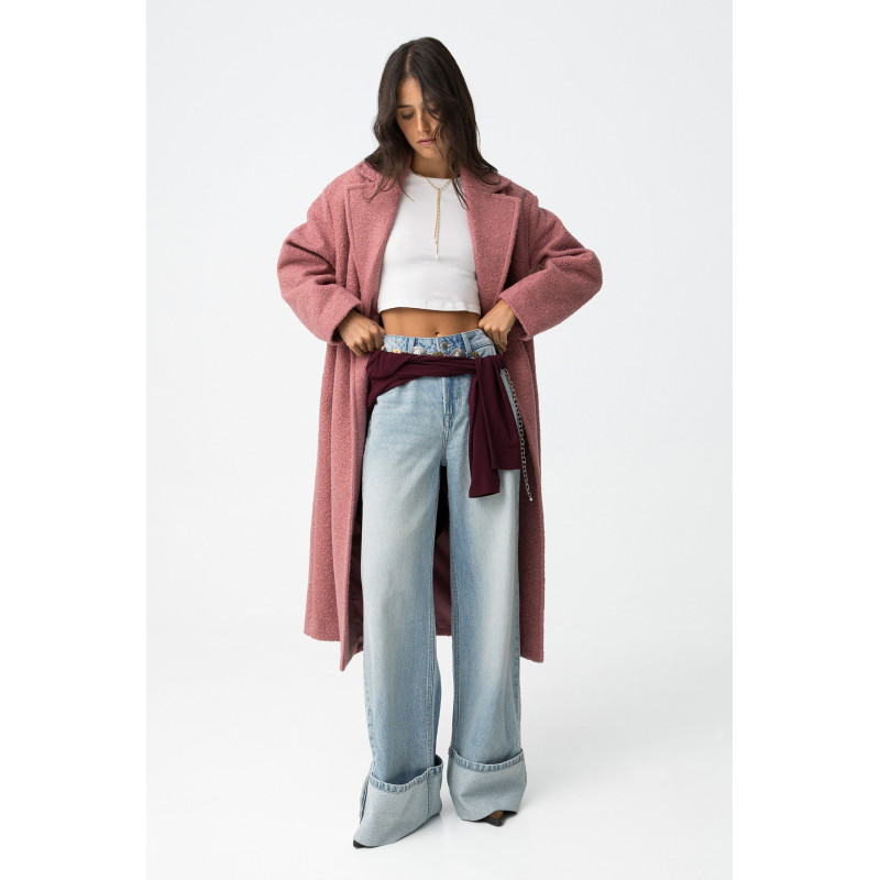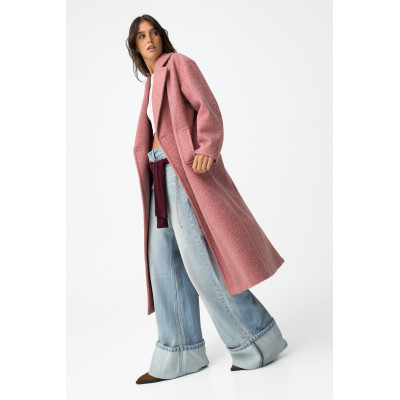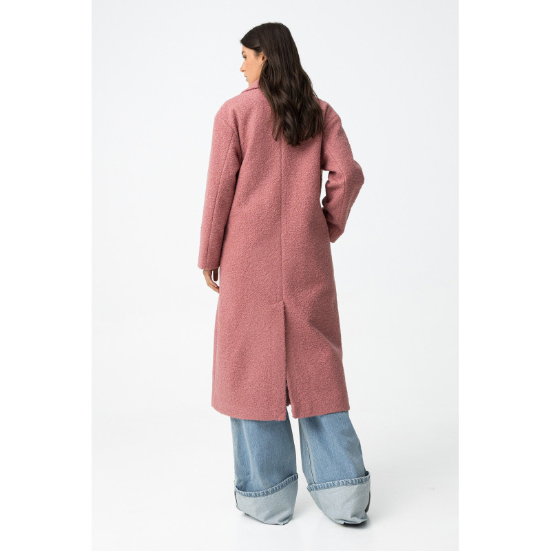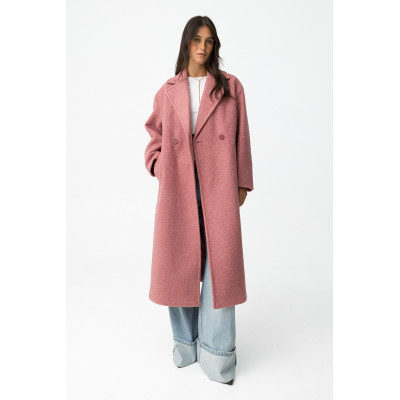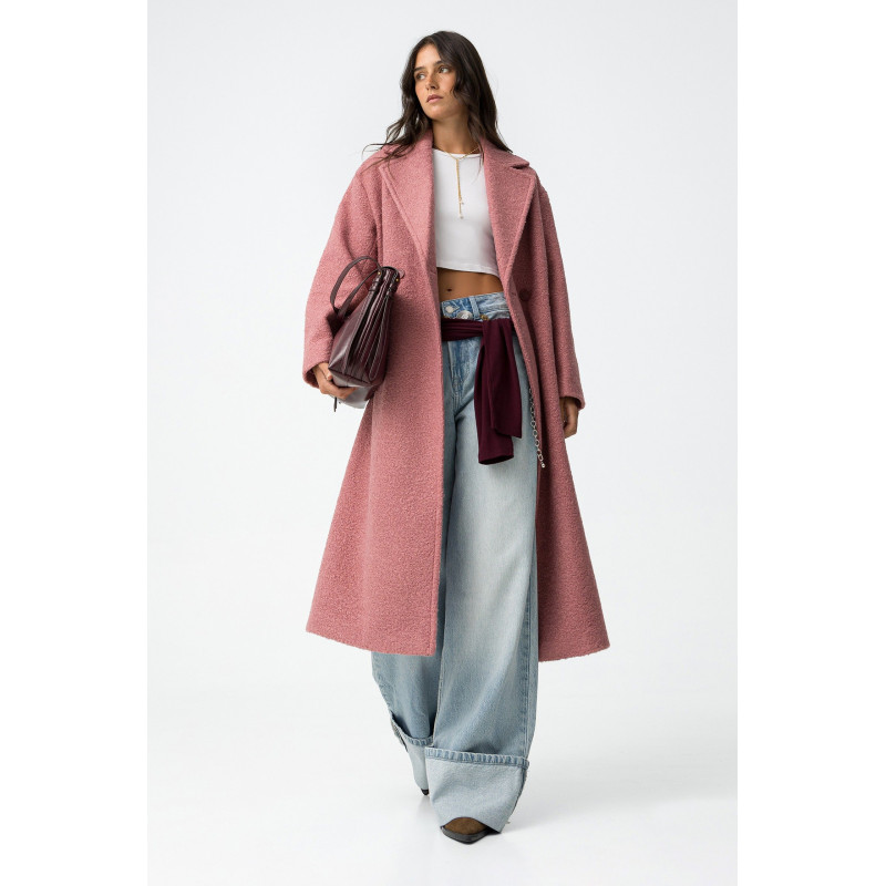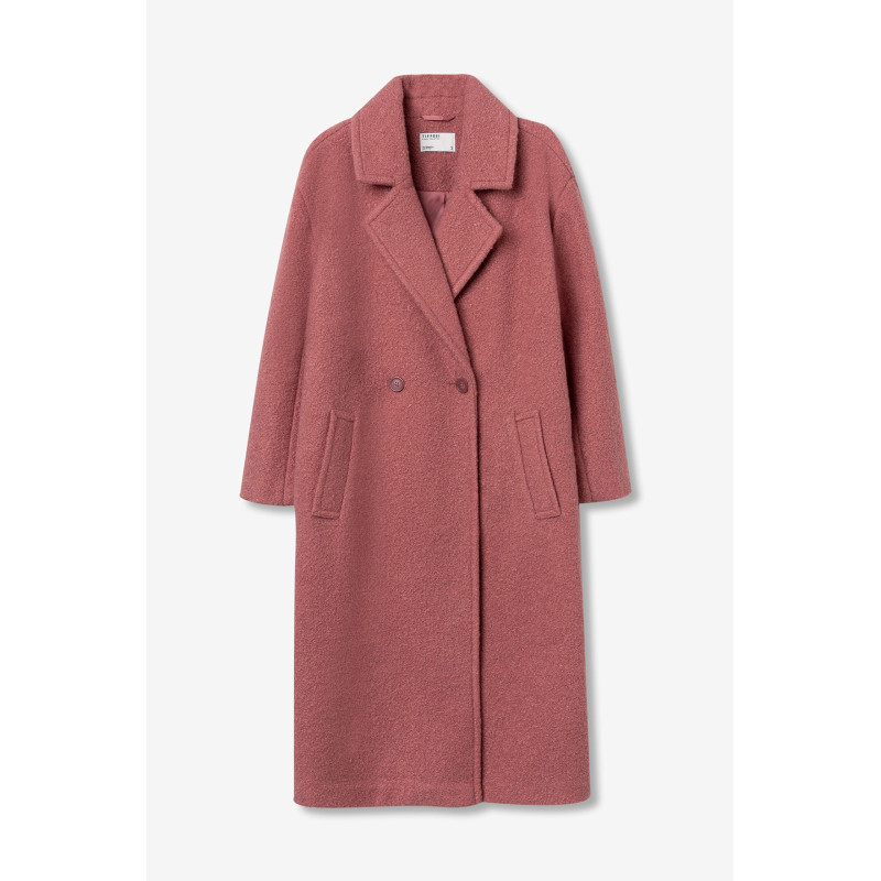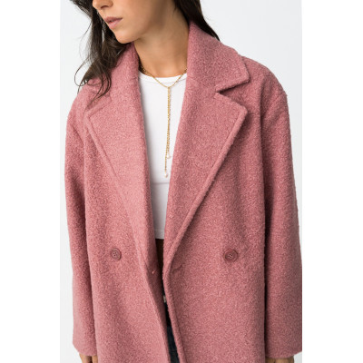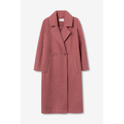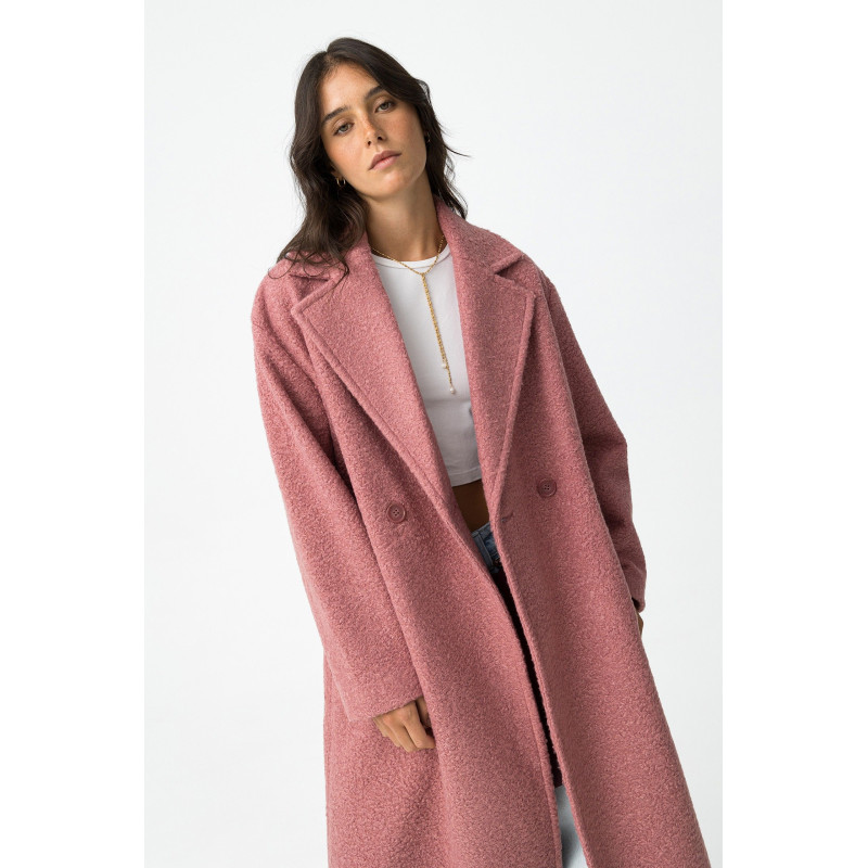 Abrigo largo de corte relaxed en bouclé, con dos bolsillos frontales, doble cruce y cierre de botón.