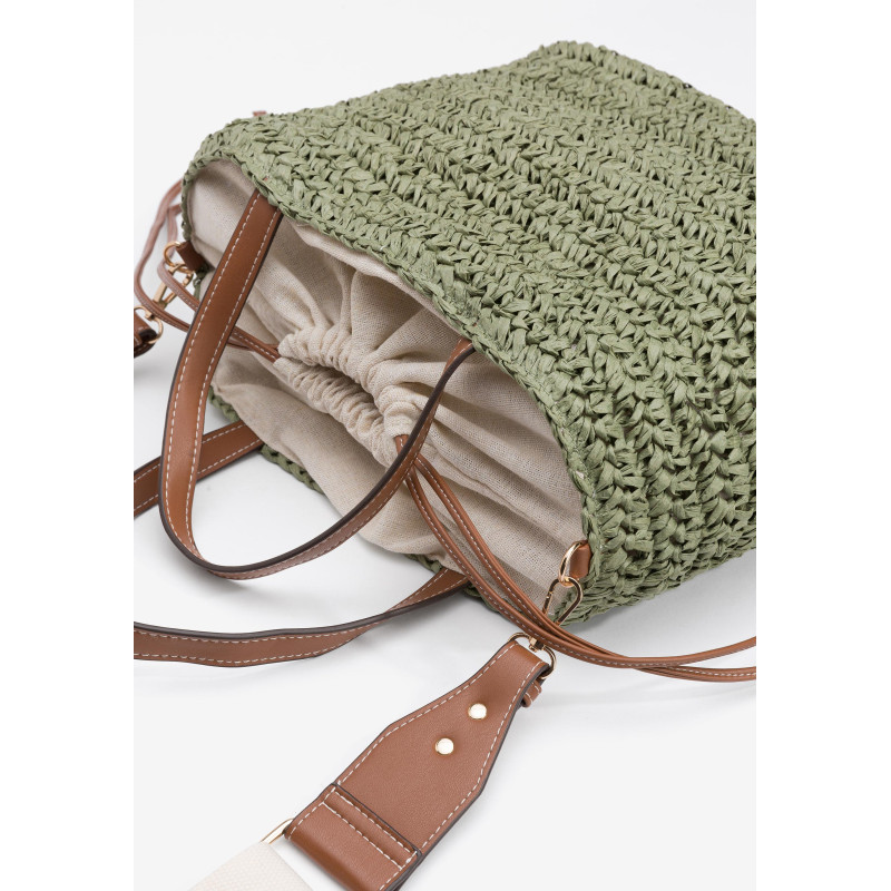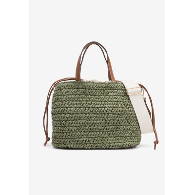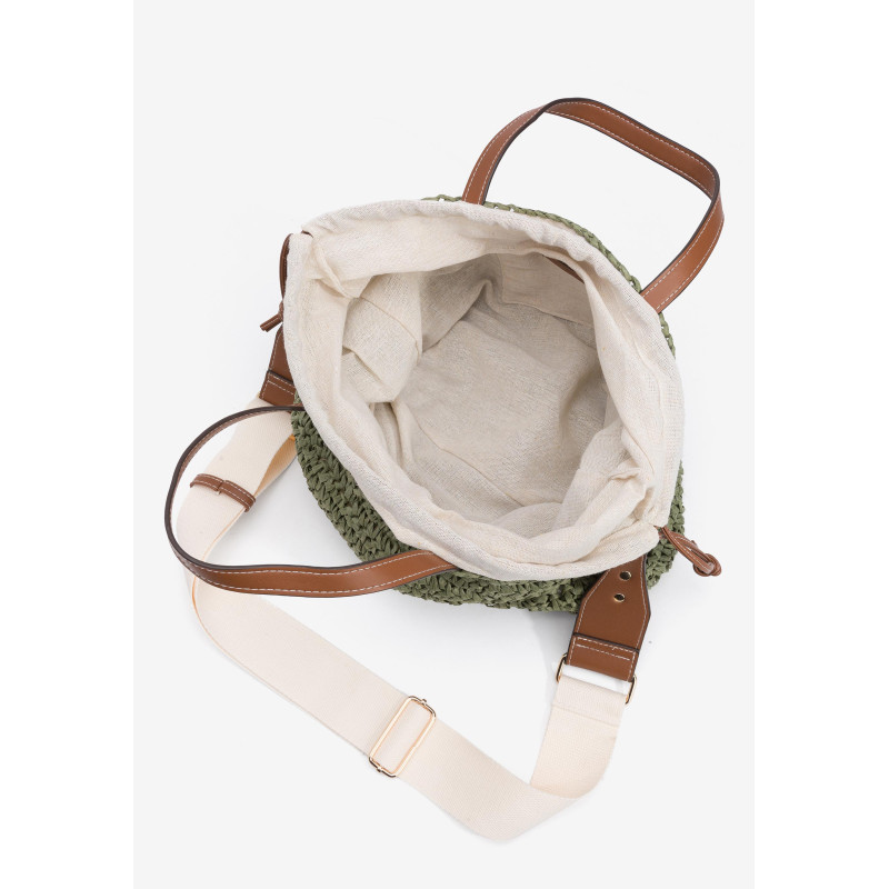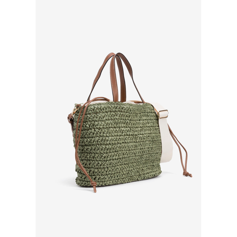 Bolso Shopper efecto paja, con piel sintética a contraste y cierre de cordón interno. Tirantes fijos y bandolera ajustable y extraíble. Interior forrado con bolsillo.