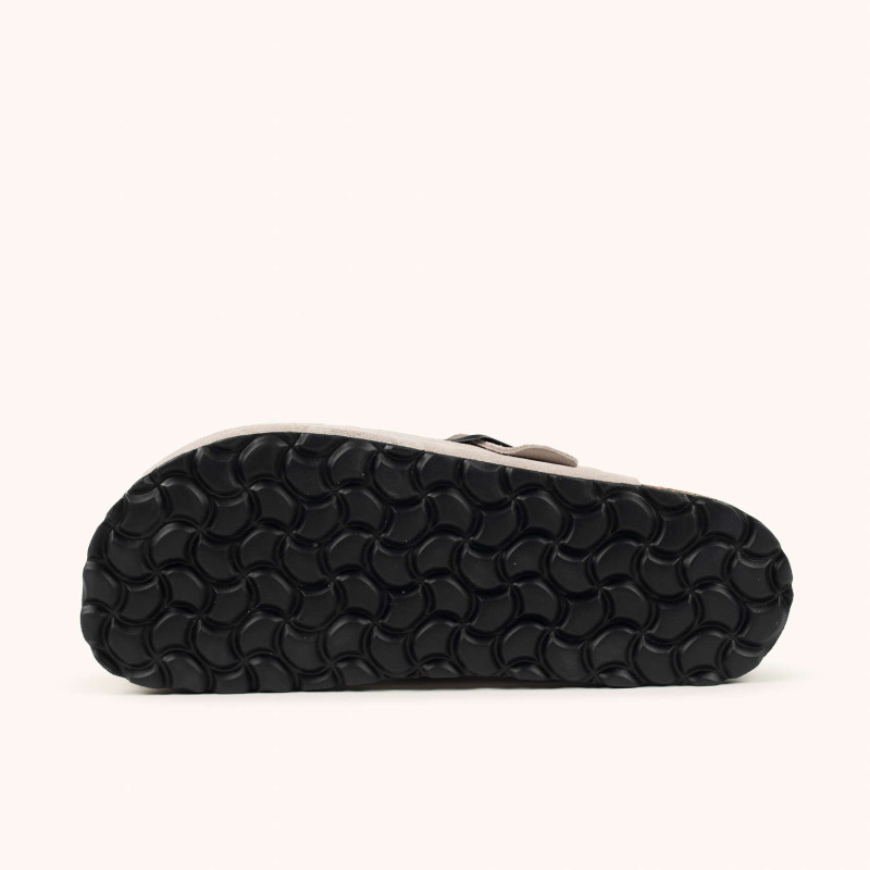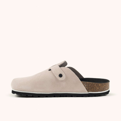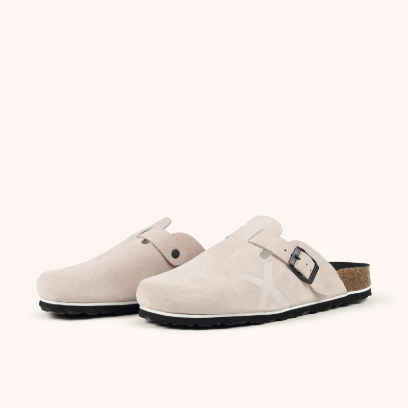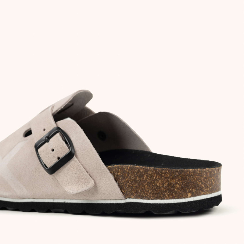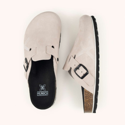 El modelo NATAL 05 es un zueco unisex que redefine la comodidad diaria a través de un diseño minimalista y materiales de alta calidad. Está confeccionado en ante (suede) de color gris perla, resaltado por una hebilla metálica en acabado negro mate que permite un ajuste personalizado. Su construcción destaca por una plantilla anatómica de corcho y microfibra que se adapta a la forma del pie, apoyada sobre una entresuela de corcho y látex y una suela de goma técnica para ofrecer una pisada suave y duradera. Es el calzado ideal para quienes buscan versatilidad y un estilo sofisticado en su rutina diaria