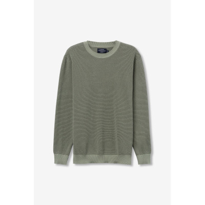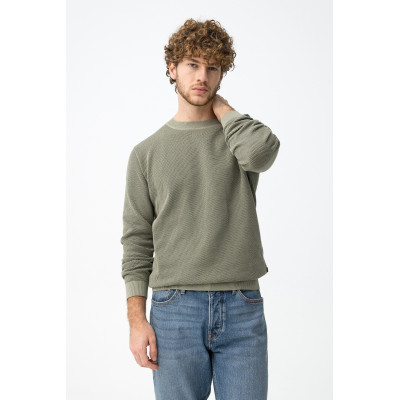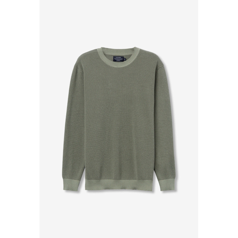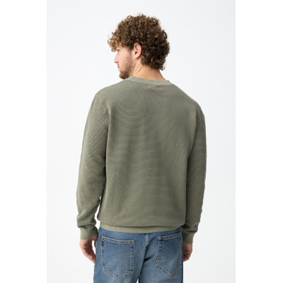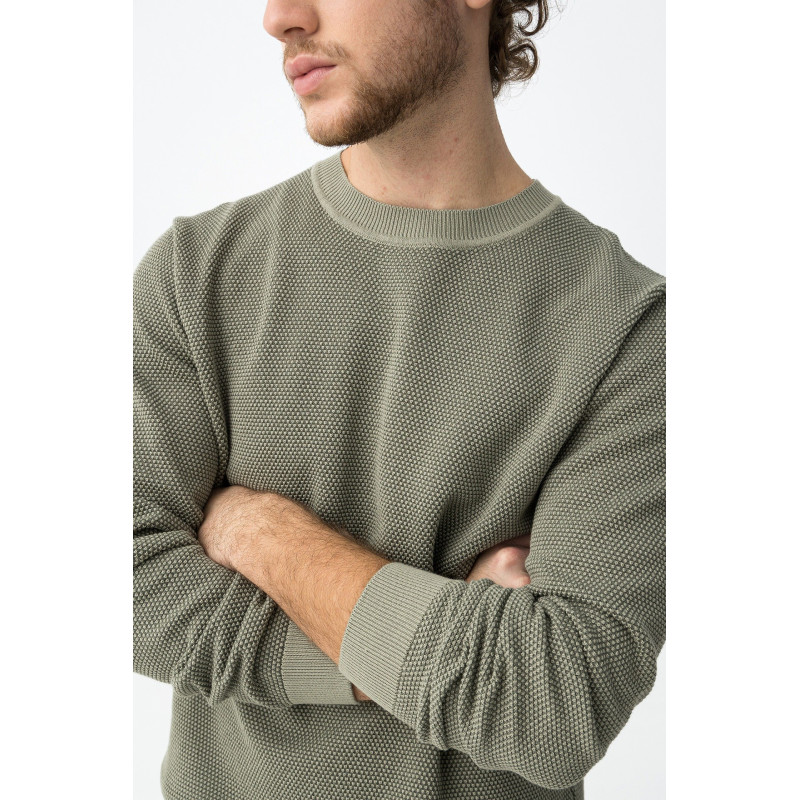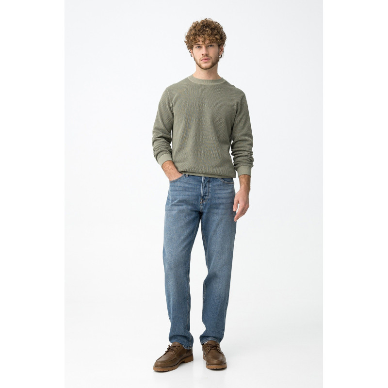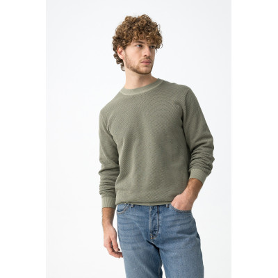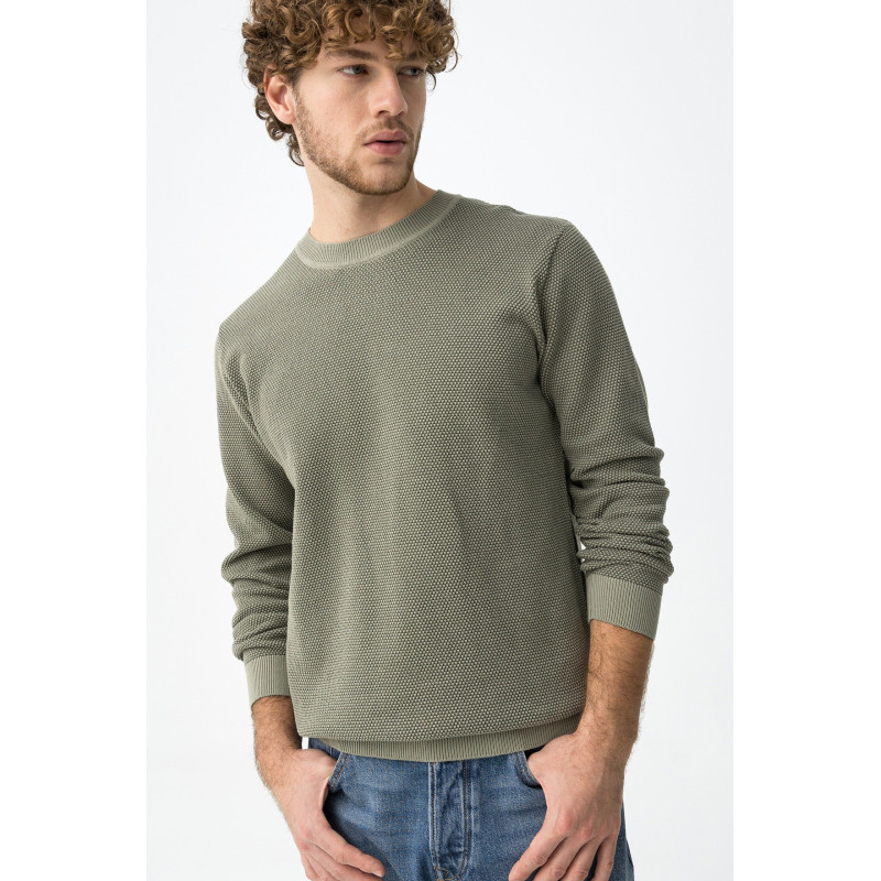 Jersey de color azul, corte regular, punto texturizado, manga larga y cuello redondo con puños elásticos.