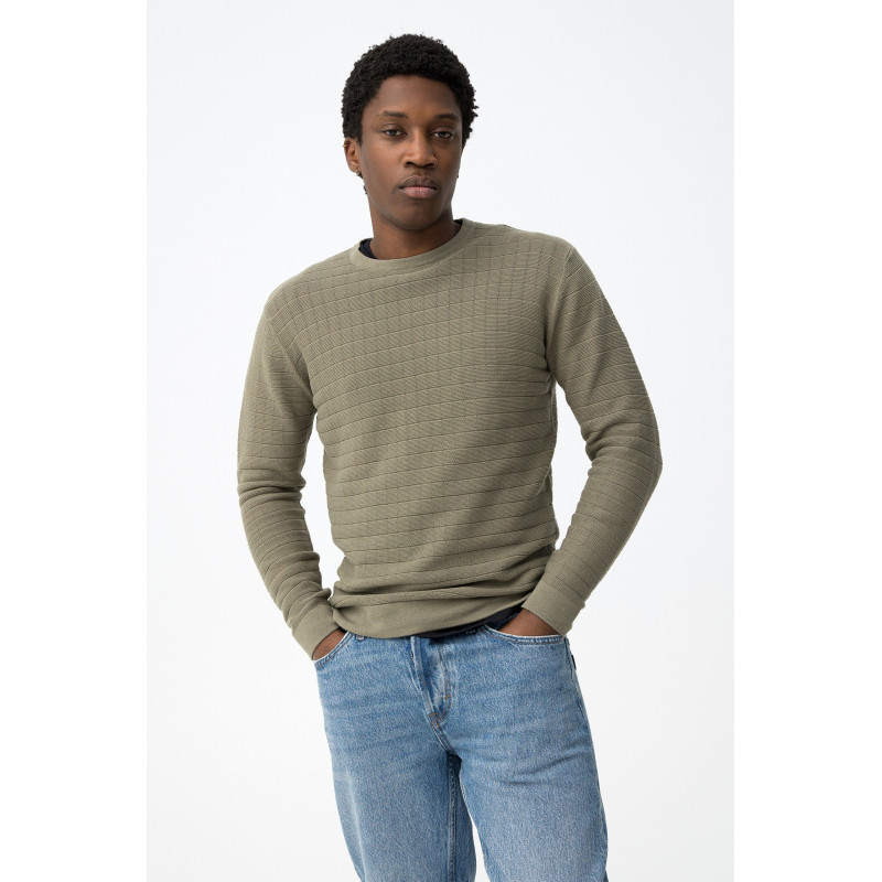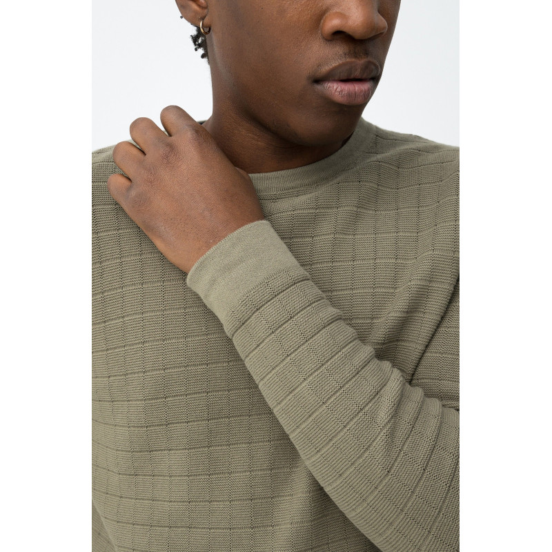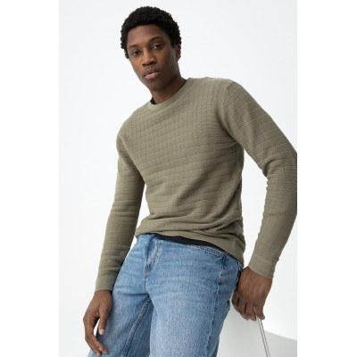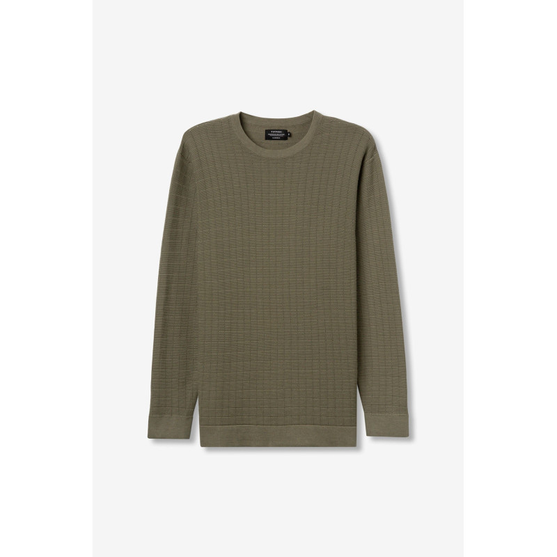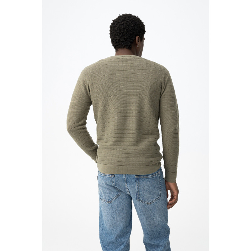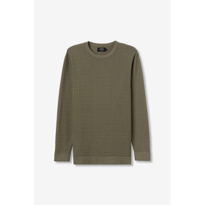 Jersey de color verde, corte regular, manga larga, textura de cuadros y cuello redondo clásico.