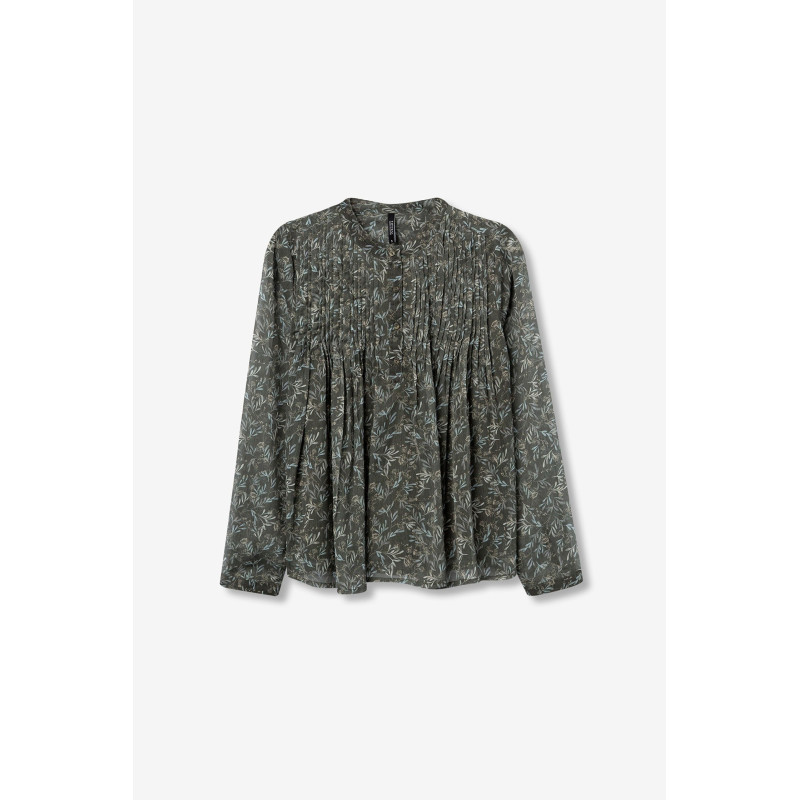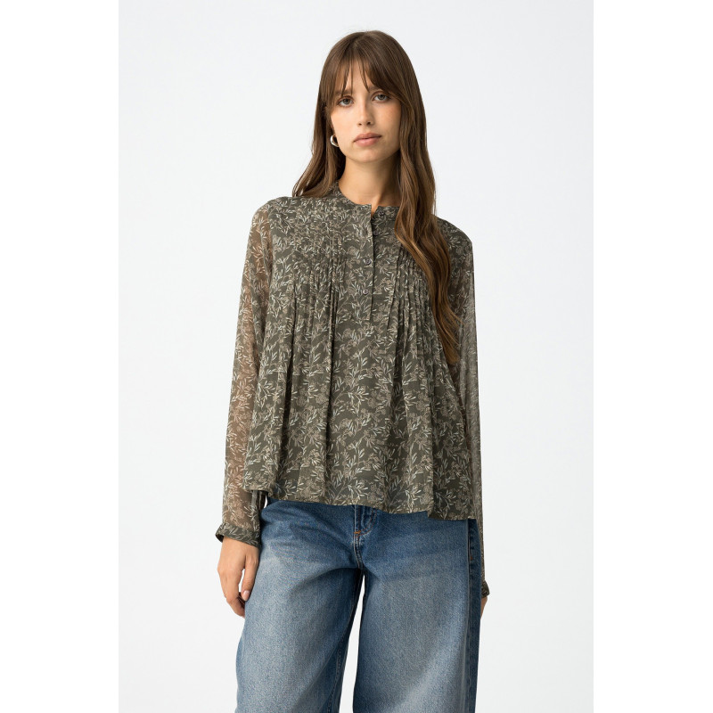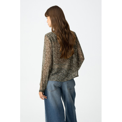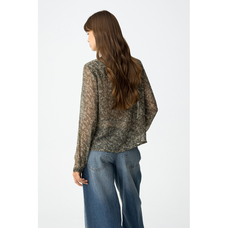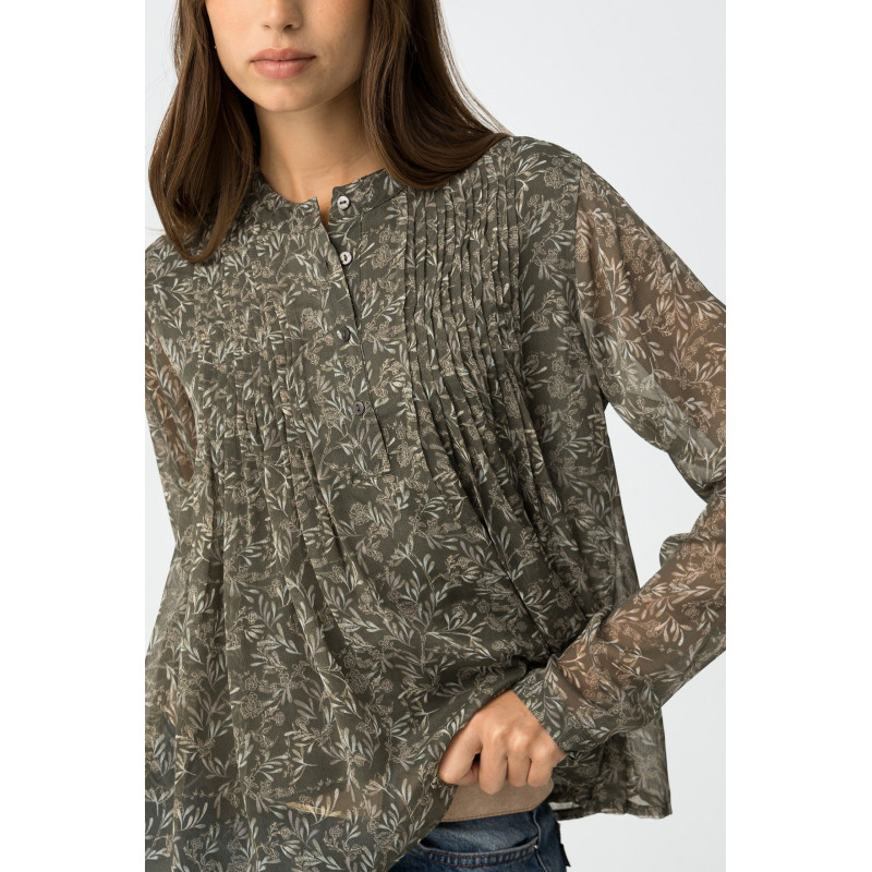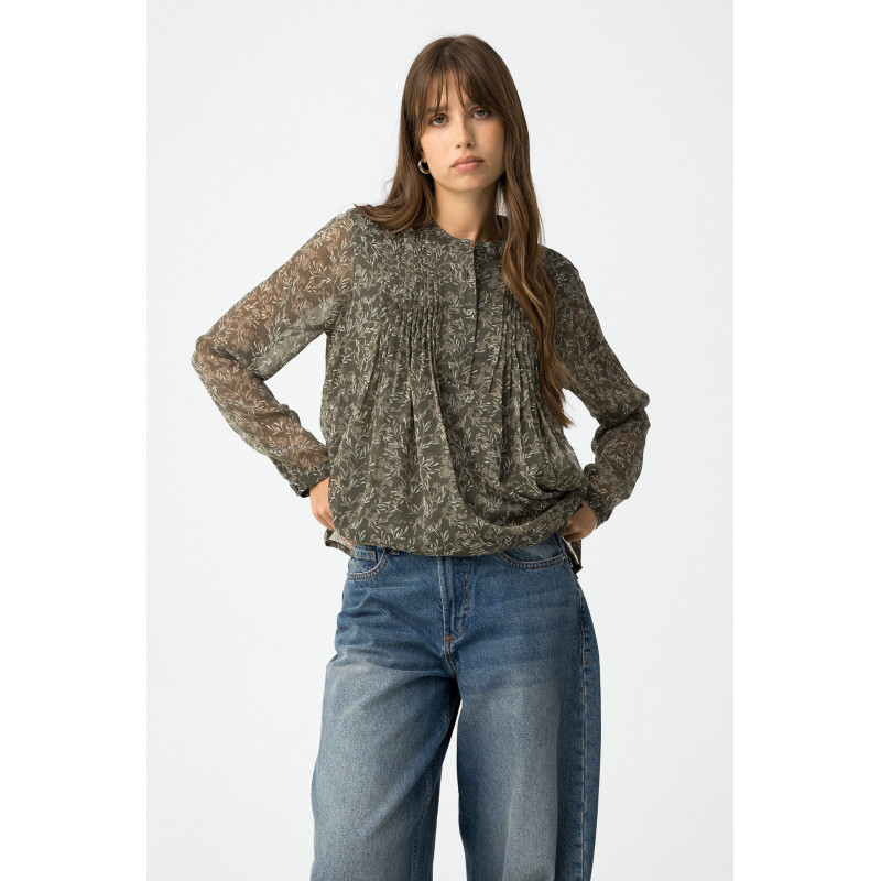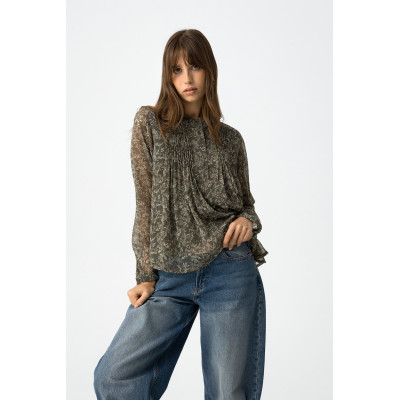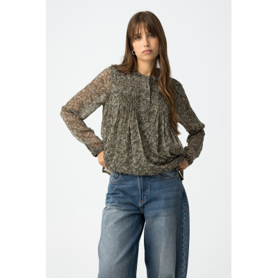 Blusa fluida estampada, con escote redondo, cierre frontal de botón y manga larga.