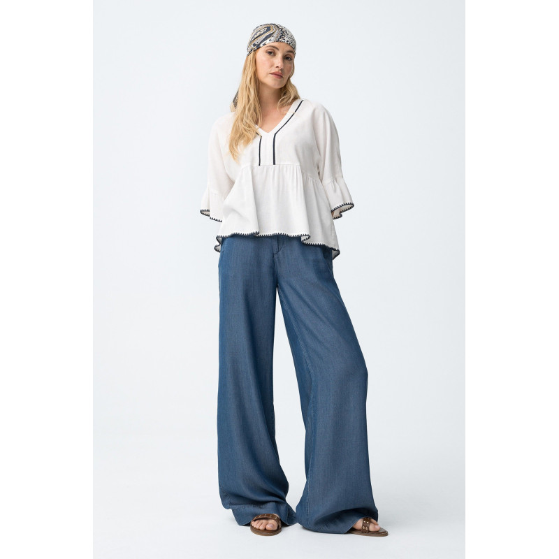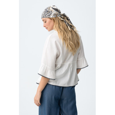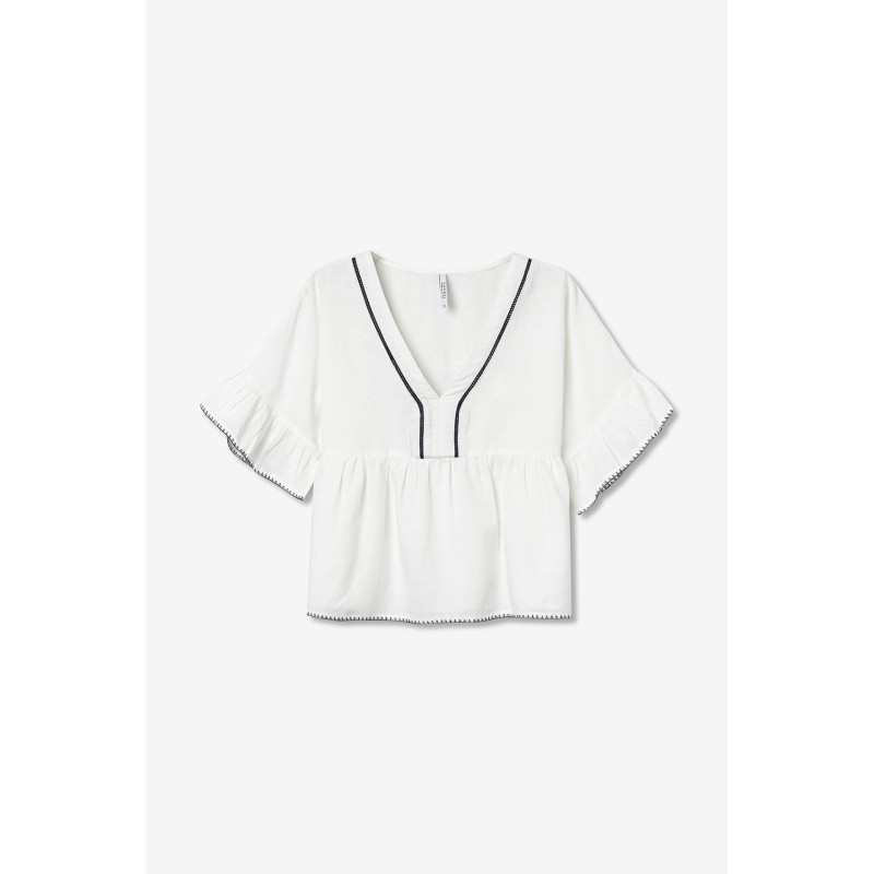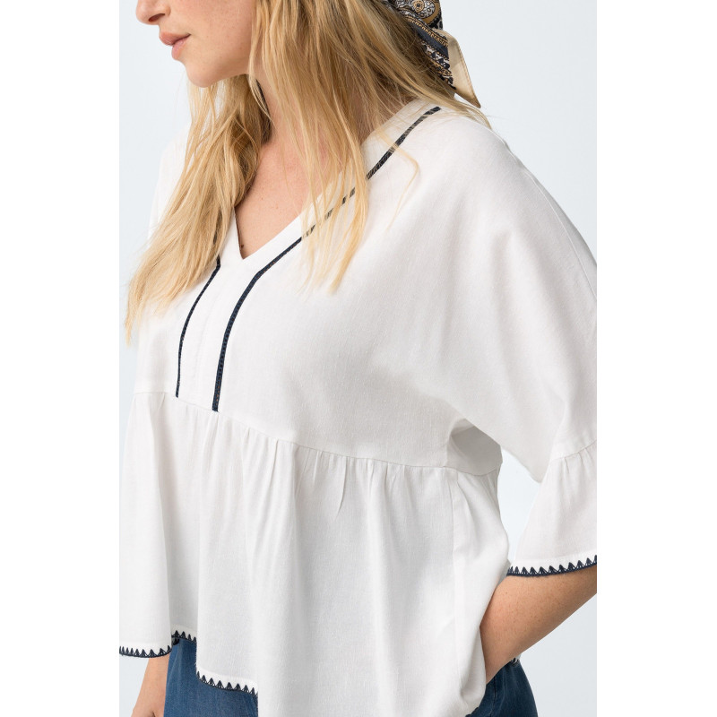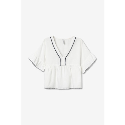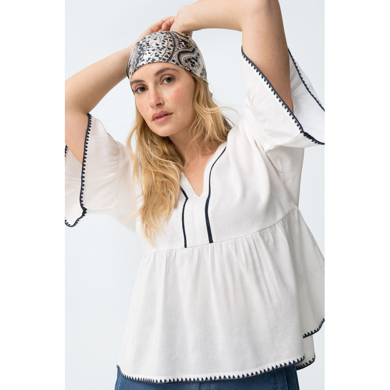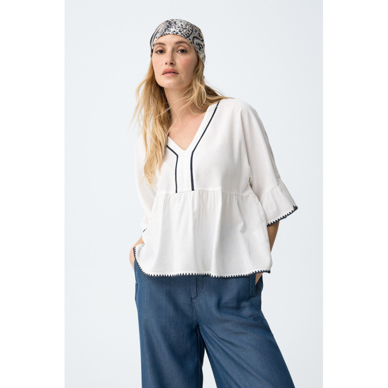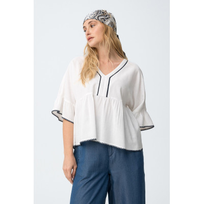 Blusa de color crudo con corte amplio, mangas cortas anchas y detalles en negro minimalista.